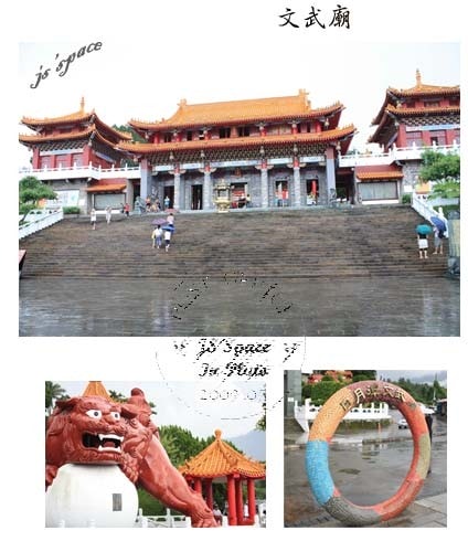 千里迢迢的跑到了這兒來 當然要逛一逛囉! 可惜天公不做美的小雨綿綿 所以先到了有名的文武廟去參拜 據說是為全台唯一開大門的孔廟 每逢考季考生的熱門去處 為了想看日月潭的全景 登上殿頂的眺…