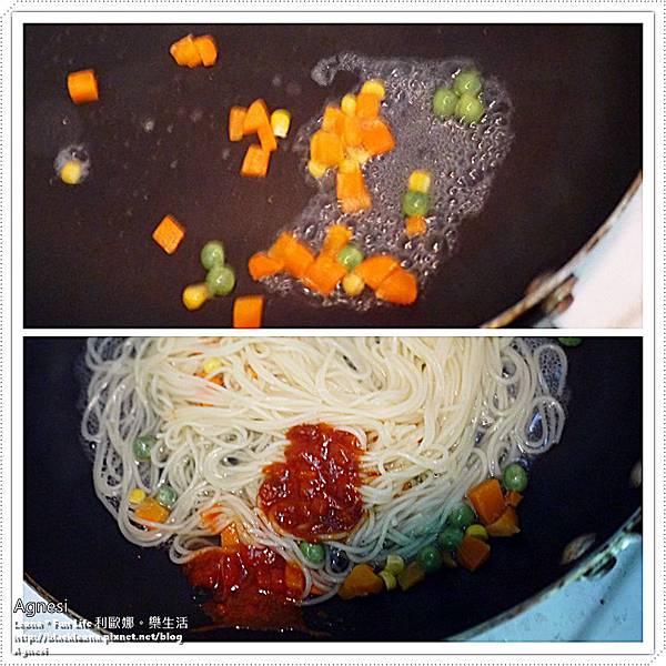 再加入煮熟的Agnesi天使髮絲義大利麵、煮麵水和Agnesi義大利番茄鮮蔬義大利麵醬,