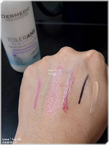 從左開始是眼線筆、腮紅、唇蜜、防水眼線和遮瑕膏~